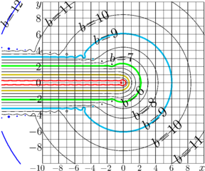 In the picture, \(b(x-\mathrm i y)\) is shown with contour lines in the \(x,y\) plane.