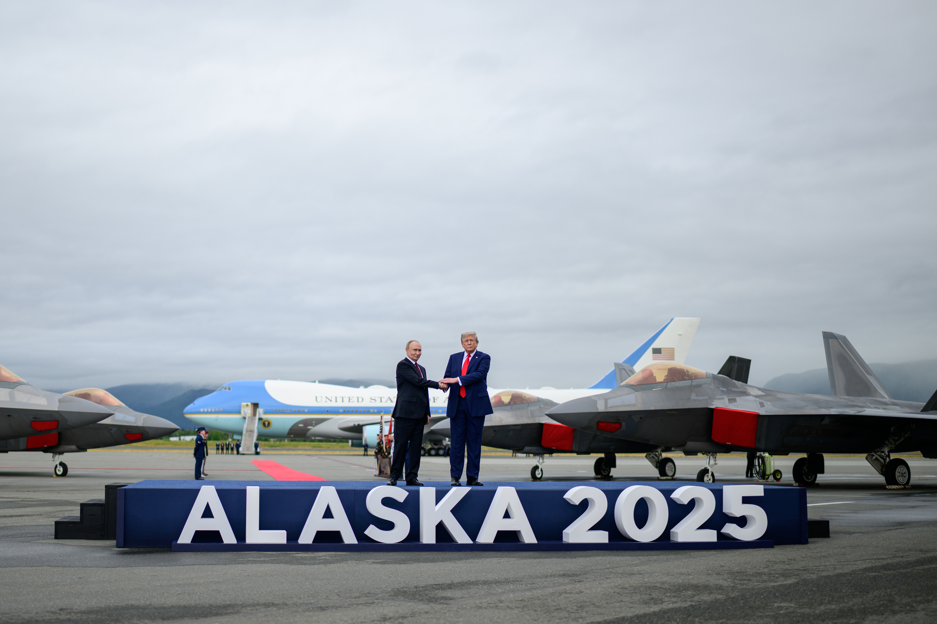 President Donald Trump greets Russian president Vladimir Putin at Joint Base Elmendorf Richardson in Anchorage, Alaska, Friday, August 15, 2025. (Official White House Photo by Daniel Torok)