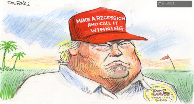 | 09:08, 20 April 2025 | TrumpMakeARecession800.jpg (file) | 63 KB | {{oq|TrumpMakeARecession800.jpg|}} Trump Make A Recession and call it winning Screenshot from movie <ref> https://www.youtube.com/watch?v=H7EfTZVB7mI&t=483 APRIL 5 Funny American Political Cartoon - Breaking News - USA Politic Caricature - Trump Satire ameriCArtoon Apr 6, 2025 MANHATTAN </ref> ==References== {{ref}} {{fer}} ==Keywords== «AmeriCArtoon», «Collapse of USA», «Donald Trump», «Make America Go Away», «Make America Great Again», «Newspeak», «[[Propag... | 1 | |