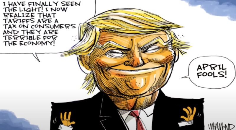 | 08:09, 4 April 2025 | Trump2025full2.jpg (file) | 65 KB | {{oq|Trump2025full2.jpg|800x440}} I have finally seen the light! I now realize tht tariffs are a tax on consumers and they are terribly for the economy! .. April fulls! Screenshot from movie <ref> https://www.youtube.com/watch?v=YDLb-uGnG2s&t=54 APRIL 1 Funny American Political Cartoon - Breaking News - USA Politic Caricature - Trump Satire ameriCArtoon Apr 2, 2025 MANHATTAN 🎨 Welcome to the ameriCArtoon ! In this video, we bring you the top political satire and funniest cartoons cove... | 1 | |