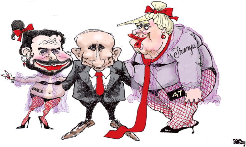 | 06:42, 6 April 2025 | VancyPuTrumy800.jpg (file) | 110 KB | {{oq|VancyPuTrumy800.jpg|}} Trump and Vance bought by Putin. Screenshot from movie <ref> https://www.youtube.com/watch?v=gXujI2dGYjw&t=195 MARCH 30 Funny American Political Cartoon - Breaking News - USA Politic Caricature - Trump Satire ameriCArtoon Mar 31, 2025 MANHATTAN </ref> ==References== {{ref}} {{fer}} ==Keywords== «[[]]», «Annexation of Crimea», «Collapse of RF», «Collapse of USA», «Corruption», «Designate Russia as state sponsor of terrorism»,... | 1 | |