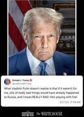 2025.05.27. https://www.facebook.com/61571700369424/posts/122134722122723345/?_rdr The White House's Post The White House and President Donald J. Trump 1d · "What Vladimir Putin doesn’t realize is that if it weren’t for me, lots of really bad things would have already happened to Russia, and I mean REALLY BAD. He’s playing with fire!" –President Donald J. Trump
