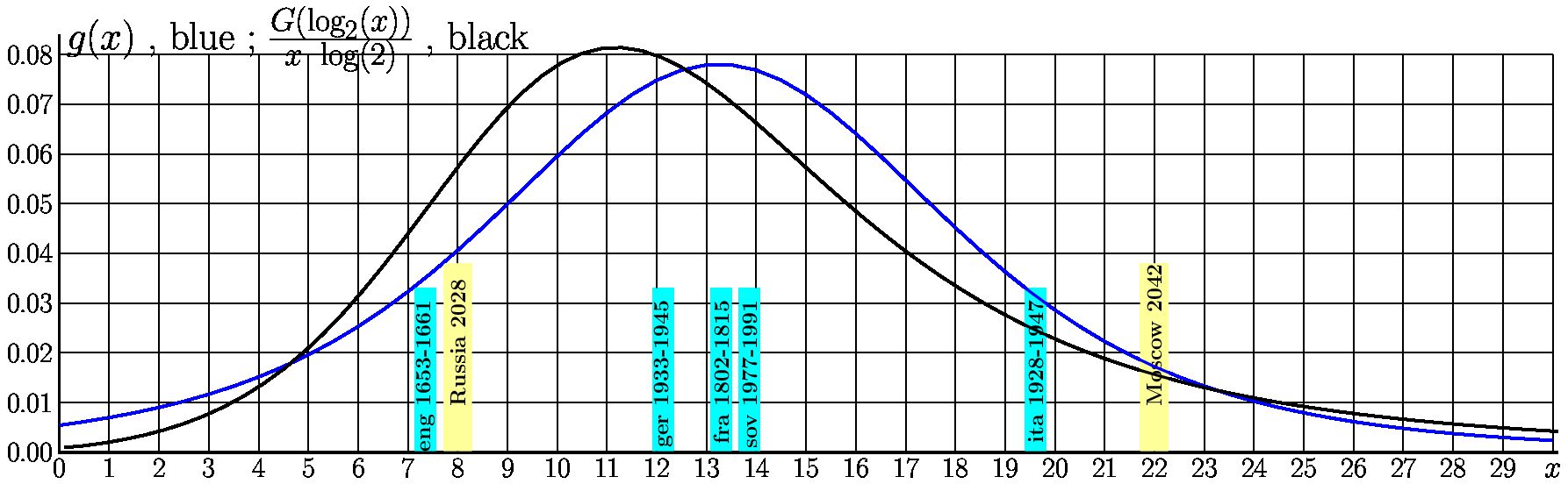 fprintf(o,"\\draw (0,8.3) node[right] {\\sx{1.8}{\\(g(x)\\) , blue ; \\(\\frac{G(\\log_2(x))}{x \\ \\log(2)}\\) , black}};\n");