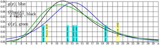| current | 20:43, 26 July 2025 | 1,786 × 508 (148 KB) | T (talk | contribs) | == Summary == {{oq|Duration5compar3.jpg|}} Likelihood density for next (6th) measurement of Duration based on the 5 previous measurements; the 3 curves refer to the 3 models: Model First: normal distribution of Duration gives function \(g\) Model Second: normal distribution of logarithm of Duration gives function \(h\) Model Third: Gamma distribution with 5 degrees of freedom gives function \(\psi\) (only the mean value is adjusted)/ The blue bars show the 5 observed values used in t... |