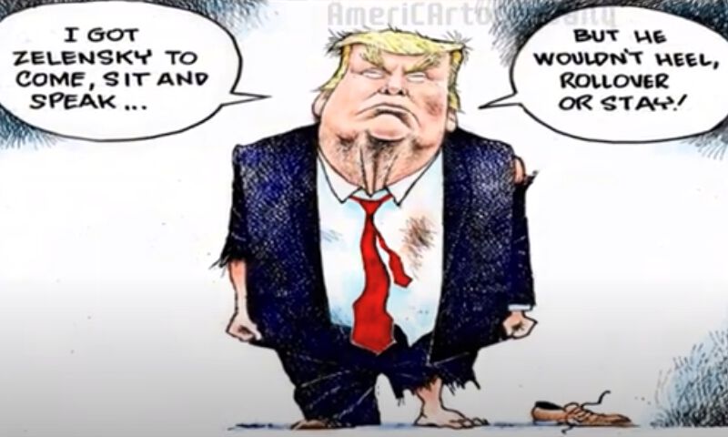 | current | 20:11, 15 August 2025 | 800 × 480 (51 KB) | T (talk | contribs) | == Summary == {{oq|20250303aCAtrumpGot.jpg|}} 2025.02.28, In the discussion with Zelensky about capitulation of Ukraine, Donald Trump pretended to be a stupid idiot, tho does not know anything about things that happen in Europe. Does not even know that RF invades Ukraine since 2014. <br> Many authors consider the discussion as winning of Zelensky. <br> This is illustrated with the cartoon. The cartoon is screenshot from movie <ref> https://www.youtube.com/watch?v=wpUsrjP5yTs&t=41s Break... |