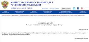 2014.02.28. Министерство Иностранных РФ дел издает приказ о выдаче российских паспортов боевикам из Беркута в Симферополе. [1].