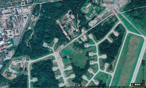 Несколько десятков Ил-76 размещены на площадках поблизости и скрыты от наземных наблюдателей перелеском.