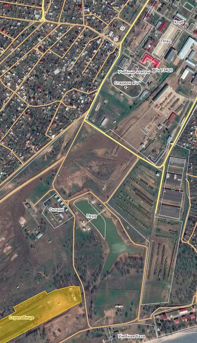 Thousands military machines are seen from the satellite in vicinity, within few km South from the main building