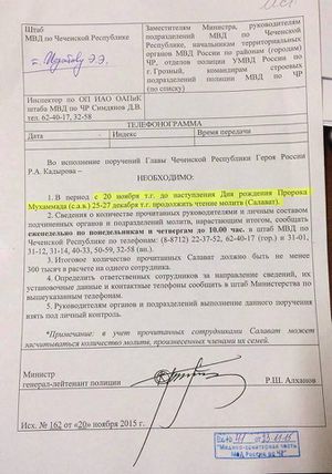 - ↑ https://tvrain.ru/news/rbk_chechenskie_politsejkie_budut_otchityvatsja_o_prochitannyh_molitvah-399111/ РБК: чеченские полицейcкие будут отчитываться о прочитанных молитвах. 19:15, 27 ноября 2015.