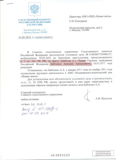 - ↑ 1.0 1.1 1.2 1.3 https://www.novayagazeta.ru/articles/2018/08/10/77463-bez-kommentariev В редакцию «Новой газеты» пришел запрос СК РФ о расследовании убийства Аркадия Бабченко в Киеве. Публикуем его. 22:21 10 августа 2018