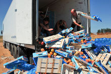 2015.08.15. http://touch.latimes.com/#section/-1/article/p2p-84210516/ CAROL J. WILLIAMS. Food fight in Russia as government bulldozes, burns illegal produce, meat imports. A bulldozer crushes 60 tons of confiscated peaches, nectarines and tomatoes in Russia's Smolensk region on Aug. 6, fulfilling a presidential decree that seized illegal food imports be destroyed. August 15, 2015, 7:55 a.m.