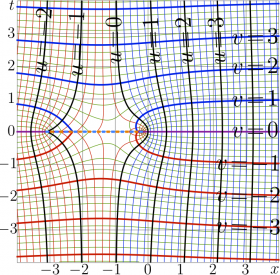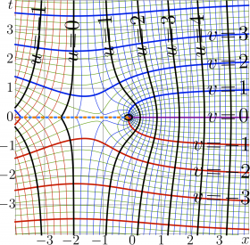 The complex map of the Doya function and its iterates is shown in figures at left; \(f\!=\!\mathrm{Doya}_t(x\!+\! \mathrm{i} y)\) is shown with Lines \(u\!=\!\Re(f)\!=\!\mathrm{const}\) and lines \(v\!=\!\Im(f)\!=\!\mathrm{const}\). However, \(F^{-1}(z)~\) should not be confused to \(F(z)^{-1}\!=\!\frac{1}{F(z)}\), and \(F^{2}(z)=F(F(z))~\) should not be confused to \(F(z)^{2}\!=\!\ F(z)\!\cdot\! F(z)\).
