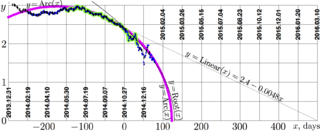 the lineal approximation of the data available 2014.10.27 (thin black straight line), and