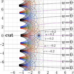 \documentclass[12pt]{article} % <br> \usepackage{geometry} % <br> \usepackage{graphicx} % <br> \usepackage{rotating} % <br> \usepackage{hyperref} % <br> \paperwidth 170pt % <br> \paperheight 169pt % <br> \textwidth 180pt % <br> \textheight 180pt % <br> \topmargin -108pt % <br> \oddsidemargin -72pt % <br> \parindent 0pt % <br> \begin {document} % <br> \newcommand \sx {\scalebox} % <br> \newcommand \rme {{e}} % <br> \newcommand \rmi {{\rm i}} %imaginary unity is always roman font % <br> \newcommand \ds {\displaystyle} % <br> \newcommand \bN {\mathbb{N}} % <br> \newcommand \bC {\mathbb{C}} % <br> \newcommand \bR {\mathbb{R}} % <br> \newcommand \cO {\mathcal{O}} % <br> \newcommand \cF {\mathcal{F}} % <br> \newcommand \rot {\begin{rotate}} % <br> \newcommand \ero {\end{rotate}} % <br> \newcommand \nS {\!\!\!\!\!\!\!\!\!\!\!\!\!\!\!\!\!\!\!} % <br> \newcommand \pS {{~}~{~}} % <br> \newcommand \fac {\mathrm{Factorial}} % <br> \begin{picture}(166,166) %<br> \put(8,5){\includegraphics{besselk0map.pdf}} % %<br> \put( 3,163){\sx{.8}{$y$}} %<br> \put( 3,143){\sx{.8}{$6$}} %<br> \put( 3,123){\sx{.8}{$4$}} %<br> \put( 3,103){\sx{.8}{$2$}} %<br> \put( 3,83){\sx{.8}{$0$}} %<br> \put(-3,63){\sx{.8}{$-2$}} %<br> \put(-3,43){\sx{.8}{$-4$}} %<br> \put(-3,23){\sx{.8}{$-6$}} %<br> \put(23,-1){\sx{.75}{$-6$}} %<br> \put(43,-1){\sx{.75}{$-4$}} %<br> \put(63,-1){\sx{.75}{$-2$}} %<br> \put(87.4,-1){\sx{.75}{$0$}} %<br> \put(107.4,-1){\sx{.75}{$2$}} %<br> \put(127.4,-1){\sx{.75}{$4$}} %<br> \put(147.4,-1){\sx{.75}{$6$}} %<br> \put(164.6,-.5){\sx{.8}{$x$}} %<br> \put(12,83.5){\bf cut} %<br> \put(142,157.8){$u\!=\!0$} %<br> \put(142,143.0){$v\!=\!0$} %<br> \put(142,127.7){$u\!=\!0$} %<br> \put(142,113.0){$v\!=\!0$} %<br> \put(142,98.0){$u\!=\!0$} %<br> \put(142,83.5){$v\!=\!0$} %central %<br> \put(142,68.0){$u\!=\!0$} %<br> \put(142,54.0){$v\!=\!0$} %<br> \put(142,39.0){$u\!=\!0$} %<br> \put(142,24.0){$v\!=\!0$} %<br> \put(142,9.0){$u\!=\!0$} %<br> % %<br> \put(102.6,93){\sx{.6}{$v\!=\!-0.2$}} %<br> \put(104,87){\sx{.6}{$u\!=\!0.2$}} %<br> \put(103,77){\sx{.6}{$v\!=\!0.2$}} %<br> \put(101.6,61){\sx{.6}{$u\!=\!-0.2$}} %<br> \put(99.4,48){\sx{.6}{$v\!=\!-0.2$}} %<br> \end{picture} % %<br> \end{document} %