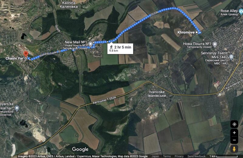 - ↑ https://www.google.co.jp/maps/dir/Хромове,+Donetsk+Oblast,+Ukraine/Chasiv+Yar,+Donetsk+Oblast,+Ukraine,+84551/@48.5828061,37.8706473,8220m/data=!3m1!1e3!4m19!4m18!1m10!1m1!1s0x40dfe88d35618bfd:0x8bd843d8ee390a20!2m2!1d37.9457378!2d48.5995533!3m4!1m2!1d37.8488158!2d48.5902884!3s0x40dfe9dd1fcfc349:0x78eec51df7f72398!1m5!1m1!1s0x40dfc265770420a7:0x6ebab1caadedcdb5!2m2!1d37.8354218!2d48.5884808!3e2?hl=en Khromove, Donetsk Oblast, Ukraine, 84591 Chasiv Yar, Donetsk Oblast, Ukraine, 84551 via О0506