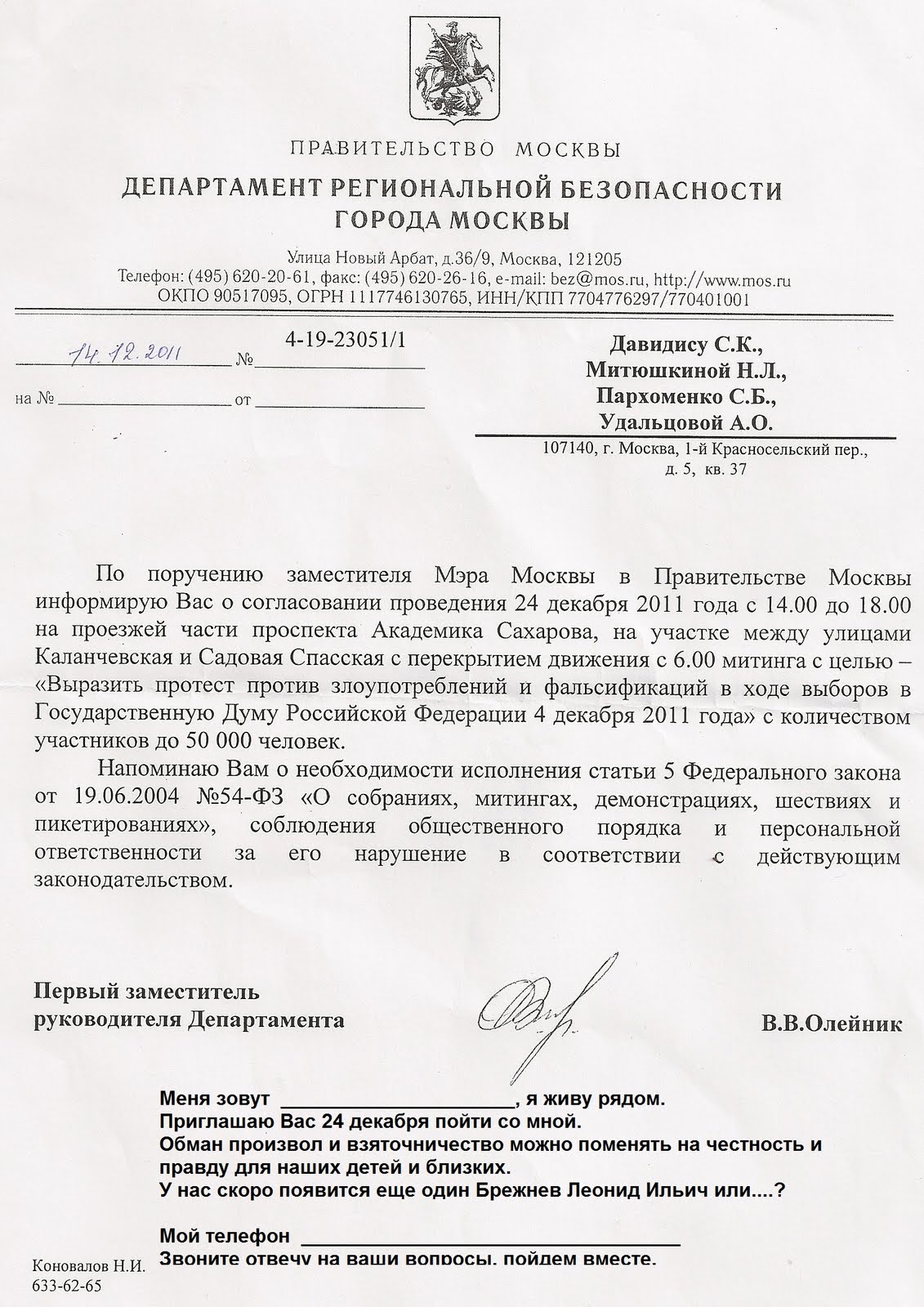 Permission for the meeting 2011.12.24 in Moscow for the protest against the fraud (falsification) at the 2011.12.04.Election.
