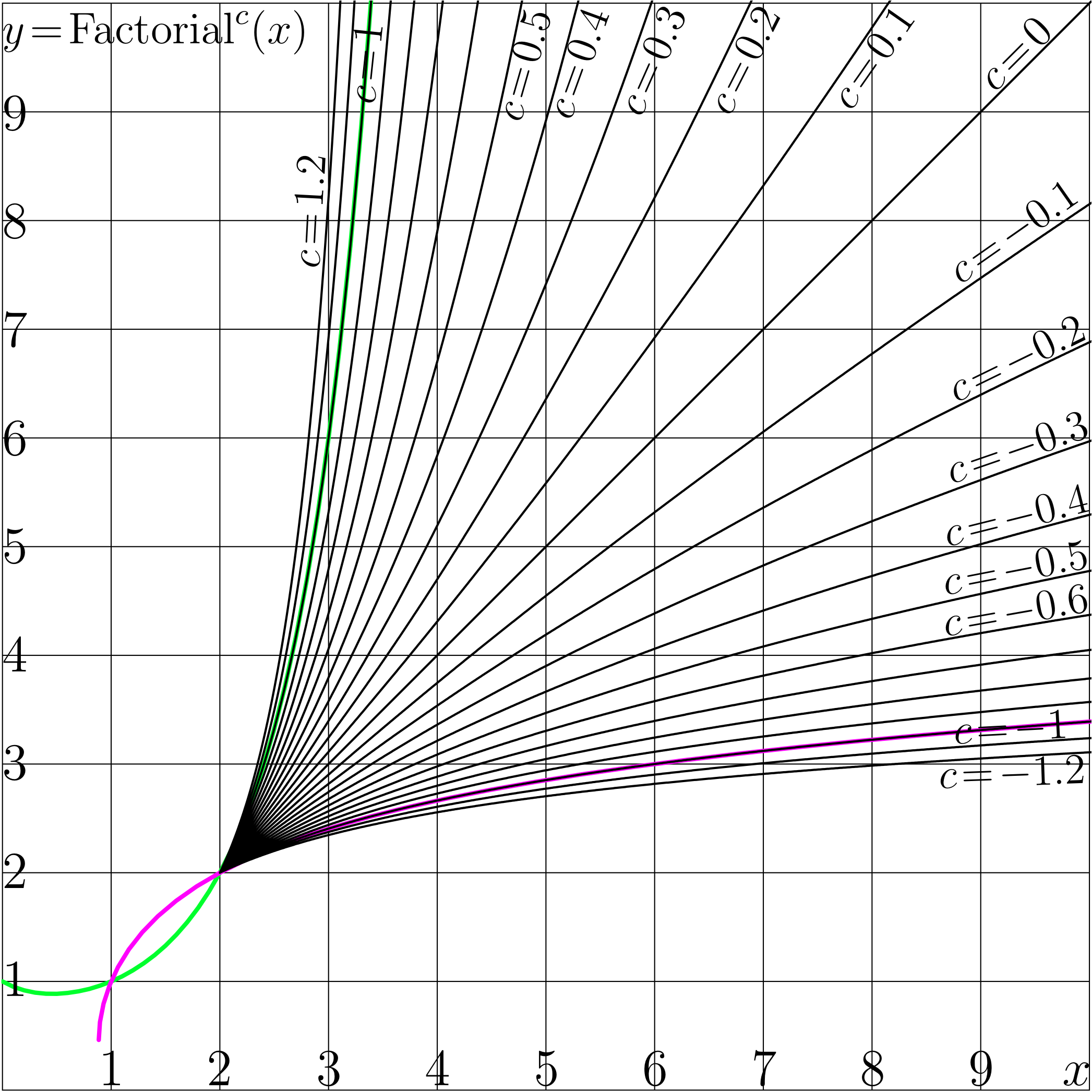 % %<br> % file IterFacPlot.pdf should be generated with the code above in order to compile the Latex document below. % % Copyleft 2012 by Dmitrii Kouznetsov <br> % \documentclass[12pt]{article} % <br> \usepackage{geometry} % <br> \usepackage{graphicx} % <br> \usepackage{rotating} % <br> \paperwidth 1008pt % <br> \paperheight 1008pt % <br> \topmargin -94pt % <br> \oddsidemargin -81pt % <br> \textwidth 1100pt % <br> \textheight 1100pt % <br> \pagestyle {empty} % <br> \newcommand \sx {\scalebox} % <br> \newcommand \rot {\begin{rotate}} % <br> \newcommand \ero {\end{rotate}} % <br> \newcommand \ing {\includegraphics} % <br> \parindent 0pt% <br> \pagestyle{empty} % <br> \begin{document} % <br> \begin{picture}(1002,1002) % <br> \put(10,10){\ing{IterFacPlot}} % <br> \put(11,978){\sx{3.4}{$y\!=\!\mathrm{Factorial}^c(x)$}} % <br> \put(11,898){\sx{4}{$9$}} % <br> \put(11,798){\sx{4}{$8$}} % <br> \put(11,698){\sx{4}{$7$}} % <br> \put(11,598){\sx{4}{$6$}} % <br> \put(11,498){\sx{4}{$5$}} % <br> \put(11,398){\sx{4}{$4$}} % <br> \put(11,298){\sx{4}{$3$}} % <br> \put(11,198){\sx{4}{$2$}} % <br> \put(11,098){\sx{4}{$1$}} % <br> % <br> \put(100,16){\sx{4}{$1$}} % <br> \put(200,16){\sx{4}{$2$}} % <br> \put(301,16){\sx{4}{$3$}} % <br> \put(401,16){\sx{4}{$4$}} % <br> \put(502,16){\sx{4}{$5$}} % <br> \put(602,16){\sx{4}{$6$}} % <br> \put(703,16){\sx{4}{$7$}} % <br> \put(803,16){\sx{4}{$8$}} % <br> \put(903,16){\sx{4}{$9$}} % <br> \put(990,16){\sx{4}{$x$}} % <br> % <br> \put(304,770){\sx{3.3}{\rot{87}$c\!=\!1.2$\ero}} % <br> \put(355,921){\sx{3.3}{\rot{84}$c\!=\!1$\ero}} % <br> \put(490,904){\sx{3.3}{\rot{74}$c\!=\!0.5$\ero}} % <br> \put(536,906){\sx{3.3}{\rot{70}$c\!=\!0.4$\ero}} % <br> \put(601,909){\sx{3.3}{\rot{66}$c\!=\!0.3$\ero}} % <br> \put(683,910){\sx{3.3}{\rot{63}$c\!=\!0.2$\ero}} % <br> \put(795,915){\sx{3.3}{\rot{55}$c\!=\!0.1$\ero}} % <br> % <br> \put(928,932){\sx{3.4}{\rot{45}$c\!=\!0$\ero}} % <br> % <br> \put(896,755){\sx{3.3}{\rot{35}$c\!=\!-0.1$\ero}} % <br> \put(892,646){\sx{3.3}{\rot{26}$c\!=\!-0.2$\ero}} % <br> \put(888,571){\sx{3.3}{\rot{19}$c\!=\!-0.3$\ero}} % <br> \put(884,513){\sx{3.3}{\rot{14}$c\!=\!-0.4$\ero}} % <br> \put(882,468){\sx{3.3}{\rot{11}$c\!=\!-0.5$\ero}} % <br> \put(882,430){\sx{3.3}{\rot{10}$c\!=\!-0.6$\ero}} % <br> % <br> \put(890,331){\sx{3.3}{\rot{3}$c\!=\!-1$\ero}} % <br> \put(876,290){\sx{3.3}{\rot{2}$c\!=\!-1.2$\ero}} % <br> \end{picture} % <br> \end{document} % <br> %