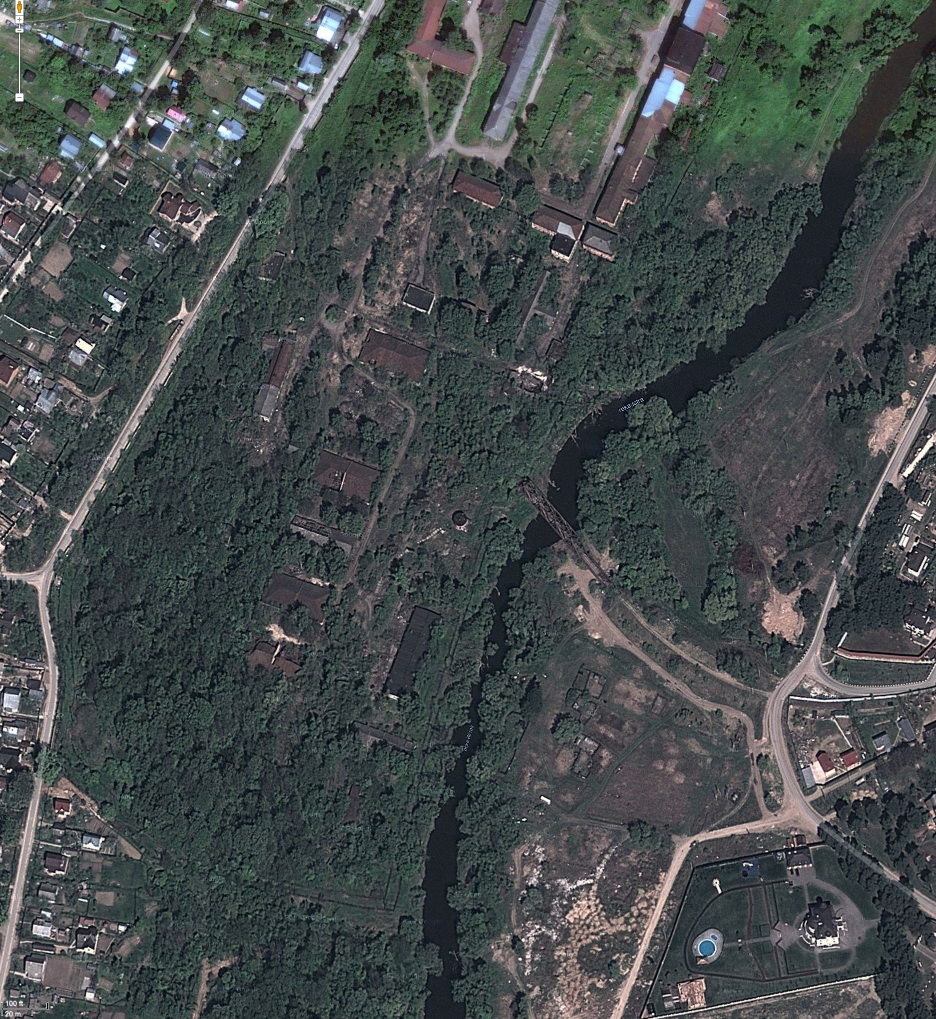 The Soviet storage of the chemical artillery weapon No.38 at the top; the railway bridge that come to degradation within a decade since the security had shouted the baidarka of Margo and Eugenii, at the center; the castle; perhaps, the residence of the current owner of the chemical weapon storage No.38, right bottom corner.