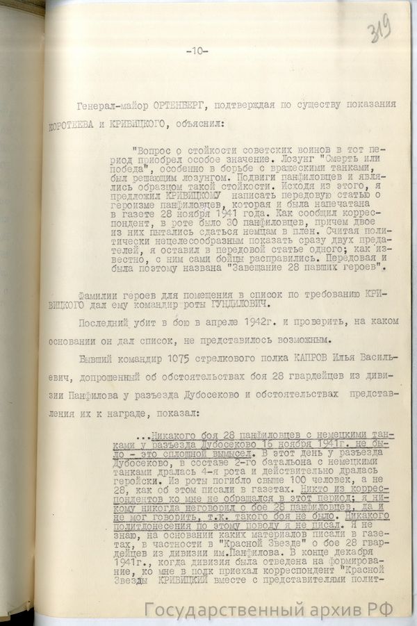 - ↑ http://www.statearchive.ru/607 Справка-доклад главного военного прокурора Н. Афанасьева "О 28 панфиловцах". В связи с многочисленными обращениями граждан, учреждений и организаций размещаем справку-доклад главного военного прокурора Н. Афанасьева «О 28 панфиловцах» от 10 мая 1948 года по результатам расследования Главной военной прокуратуры, хранящуюся в фонде Прокуратуры СССР (ГА РФ. Ф. Р-8131) . Четверг, 17 Марта 2016 года, 12:57.