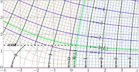 Complex maps of the \(n\)th iteration of exponential, \(f=\exp^n(x+\mathrm i y)\) are shown in figures at right with lines \(u=\Re(f)\) and lines \(v=\Im(f)\) for various values \(n\) in the \(x\),\(y\) plane. As the function is real-holomorphic, the maps are symmetric; so the only upper half plane is shown in the figures.