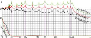 Roughly, the agreements indicate, how many correct decimal digits can be achieved at the use of korifit76 instead of function kori. In particular the upper curve, \(y=\mathrm{agreeA}(x)\), shows, that at the integration with this approximation from zero to at least 42 with a complex exponent, the errors of fitting do not make the precision worse, as it is determined by the precision of evaluation of function in vicinity of zero (where it is of order of unity.