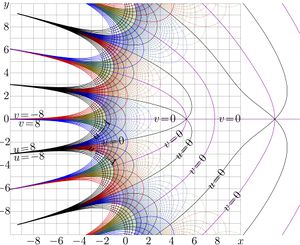 Complex map of function nori is shown at rites with levels \(u=\mathrm{const}\) and levels \(u=\mathrm{const}\),