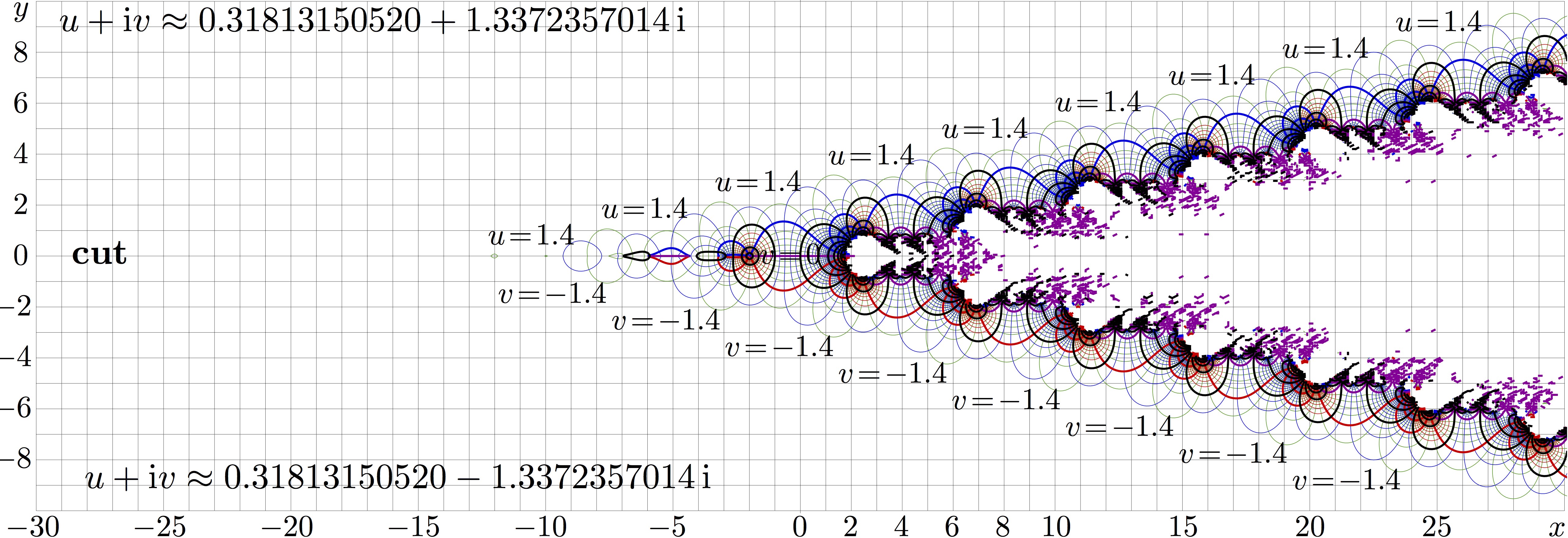 \put(20,200){\sx{1.4}{$u+\mathrm i v \approx 0.31813150520 + 1.3372357014 \,\mathrm i$}}