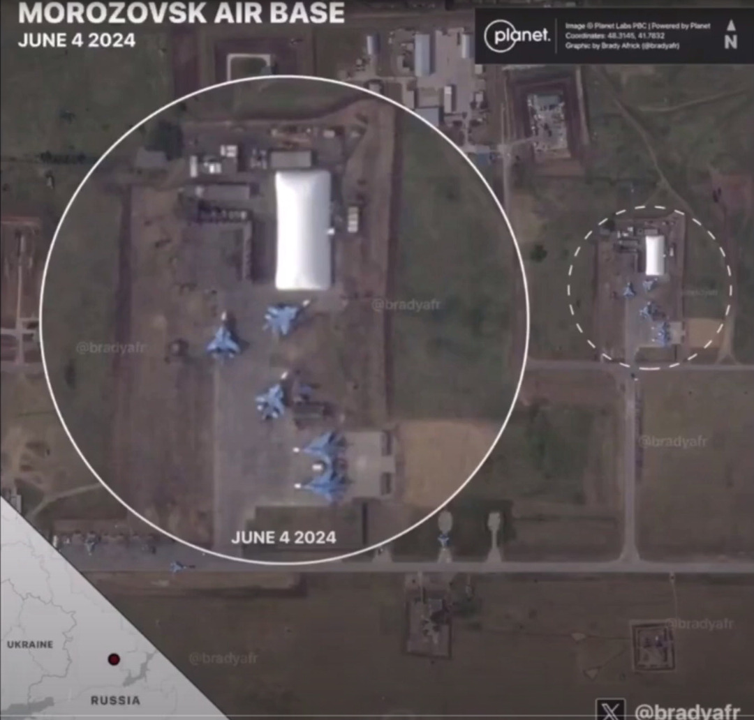 ({{oq|MorozovskScr2024.06.04.jpg|}} Fragment from satellite view of the Morozovsk airbase (Авиабаза Морозовск) from 2024.06.04 centered at 48.3173, 41.7975 Screenshot from movie<ref> https://www.youtube.com/watch?v=5odRT_34W7w...) |