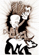 Выдвижение Медведевым Путина в качестве кандидата в президенты от едра в 2011 году спровоцировало много насмешек и карикатур; вверху, на правом рисунке Путин сам себя коронует, используя для этого марионетку.