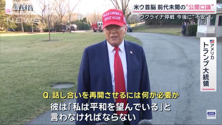 - ↑ https://www.youtube.com/watch?v=VXd14a8NCfM 米ウクライナ首脳会談決裂 約5分間の“公開口論”ノーカット【サタデーステーション】(2025年3月1日) ANNnewsCH Mar 2, 2025