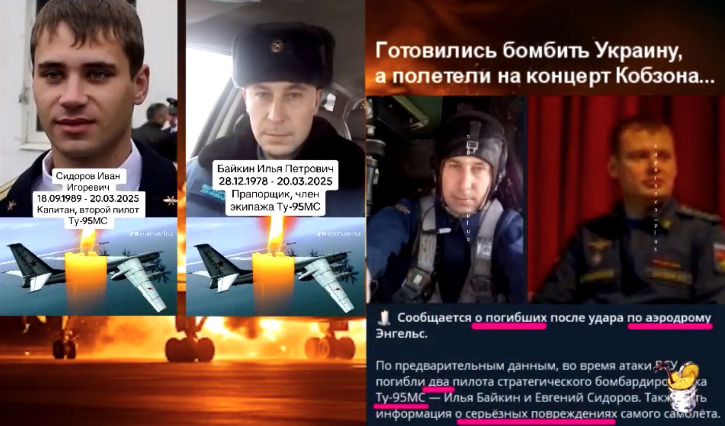 | current | 04:10, 24 March 2025 | 1,426 × 838 (149 KB) | T (talk | contribs) | == Summary == {{oq|Engels2025march2pilots.jpg|}} Байкин Илья Петрович (Baikin Ilia Petrovich, 1978.12.28, - 2025.03.20, Авиабаза Энгельс) and Сидоров Иван Игоревич (Sidorov Ivan Igorevich, 1989.09.18 - 2025.03.20, Авиабаза Энгельс), второй пилот Ту-95МС (Ty-95MC) Screenshot from movie <ref> https://www.youtube.com/watch?v=M8JUqy3_D9o&t=407 Бомбардировщики в цинке: Энгельс-2 в оцеплении химвойск, станция Кавказская вышла из чата Самый сок 2 Mar 21, 2025 А... |