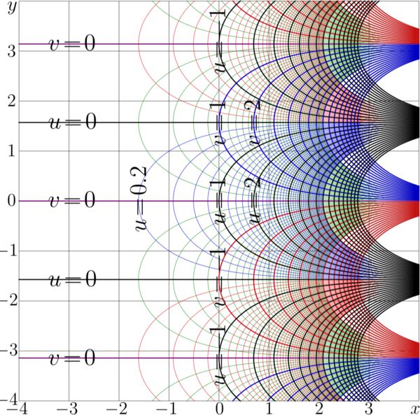 Complex map of exp: \[u+\mathrm iv=\exp(x\!+\!\mathrm iy)\]