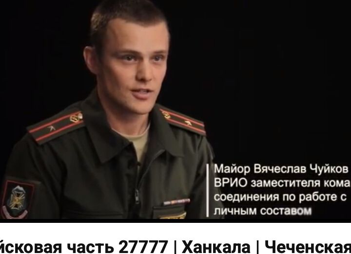 | 12:58, 18 March 2026 | ChuikovViacheslavScr720x522.jpg (file) | 36 KB | T | == Summary == {{oq|ChuikovViacheslavScr720x522.jpg||}} Чуйков Вячеслав, замполит Вч 27777, Ханкала <ref> https://www.youtube.com/watch?v=d-z96c3MKtI&t=563 Войсковая часть 27777 | Ханкала | Чеченская республика | Военная служба ВОЕННАЯ СЛУЖБА \ АРМИЯ \ КОНТРАКТНИК Aug 15, 2019 18-я отдельная гвардейская мотострелковая Евпаторийская Краснознамённая бригада. Пункты постоянной дислокации п. Ханкала и ст. Калиновская (Чеченская Республика). </ref>, 2019. Подозревется... | 1 | |