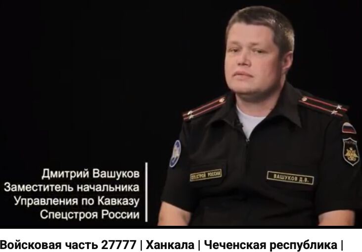 | 12:57, 18 March 2026 | VashukovDmitriScr732x510.jpg (file) | 32 KB | T | == Summary == {{oq|VashukovDmitriScr732x510.jpg||}} Вашуков Дмитрий В. (Vashukov Dmitri), российский военный чиновник, агент Вч 2777 (Ханкала), пособник путинского режима. Screenshot from movie <ref> https://www.youtube.com/watch?v=d-z96c3MKtI&t=478s Войсковая часть 27777 | Ханкала | Чеченская республика | Военная служба ВОЕННАЯ СЛУЖБА \ АРМИЯ \ КОНТРАКТНИК Aug 15, 2019 18-я отдельная гвардейская мотострелковая Евпаторийская Краснознамённая бригада. Пункты по... | 1 | |